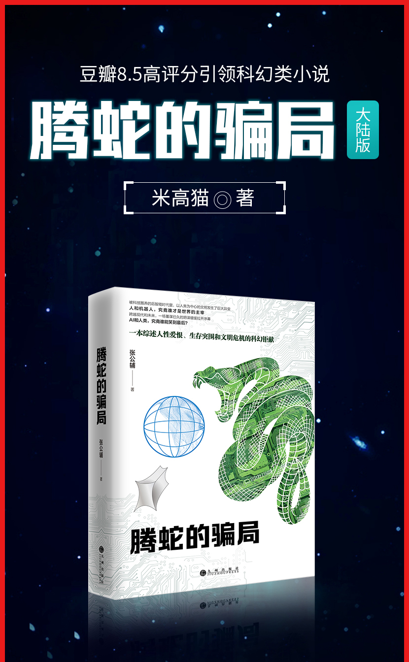 米高猫:《腾蛇的骗局》(上册)大陆版 九州出版社——被科技圈养后的智能时代里,以人类为中心的文明发生了巨大异变,人和机器人,究竟谁才是世界的主宰,AI和人类,究竟谁能笑到最后