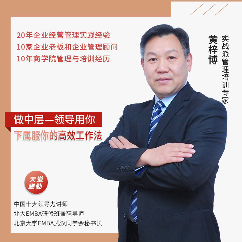 黄梓博,实战派企业中高层管理专家,国家注册高级企业培训师,国家注册心理咨询师,武汉中鼎时代管理咨询公司董事长,北京大学EMBA武汉同学秘书长,武汉光谷中小企业科技创新协会秘书长。有着多年军旅生活历练和近20年的企业经营管理经验,担任多家企业管理顾问,其创造的实用中高层管理智慧落地课程深受企业青睐。
