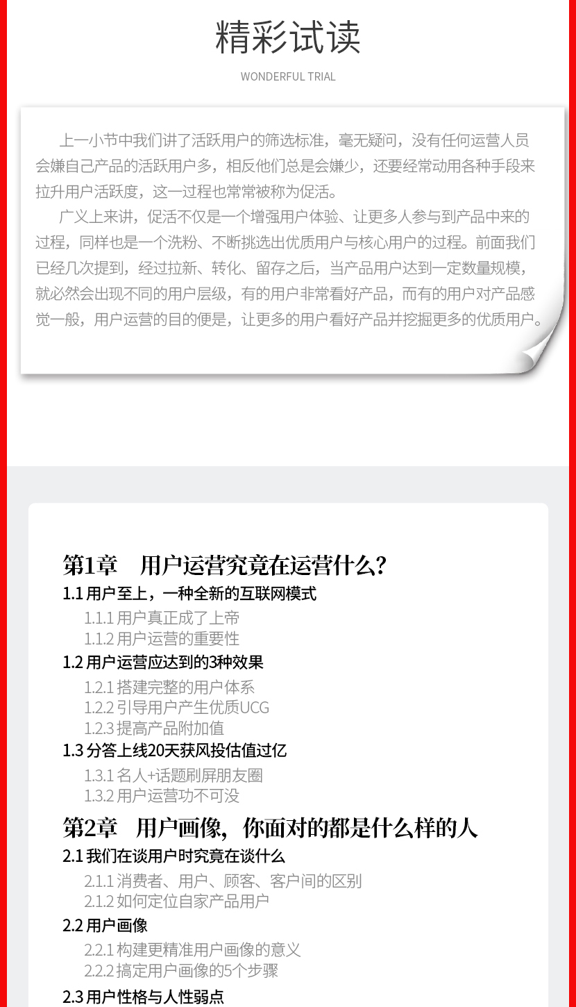 马彦威:《用户运营:布局策略+经典案例+实战技巧》本书内容先讲解了用户运营究竟在运营什么,随后又讲解了用户运营的落脚点——数据分析、用户行为轨迹复盘——行为分析等。。