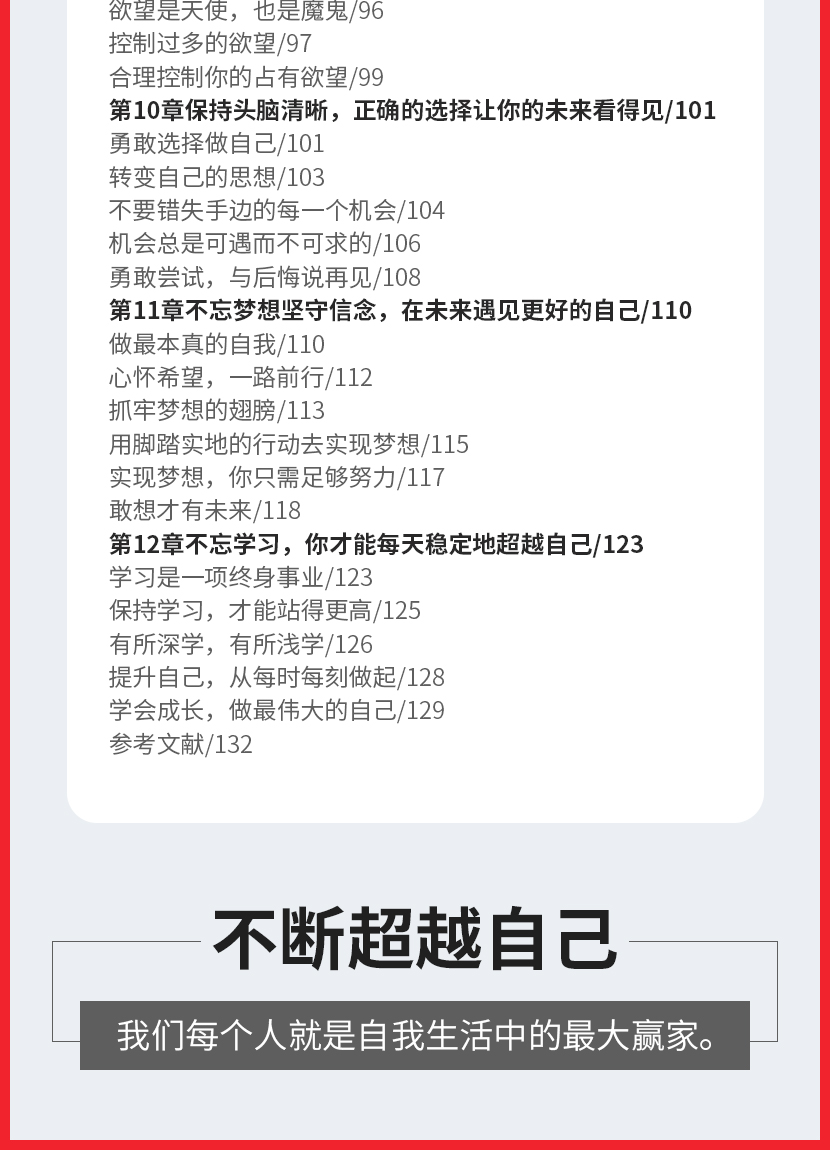 《不去与他人相比,努力超越自己》人最大的敌人,其实是自己,阅读驯化思维,幸福源于心流,成就是自驱的副产品,不断超越自己,我们每个人就是自我生活中的最大赢家!