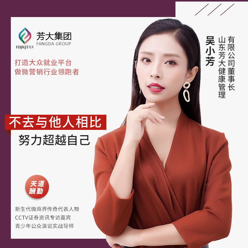 山东芳大健康管理有限公司董事长,颐源堂、仁和闪亮、集草年华、健百滋等品牌联合创始人,新生代微商界传奇代表人物,CCTV证券资讯专访嘉宾,