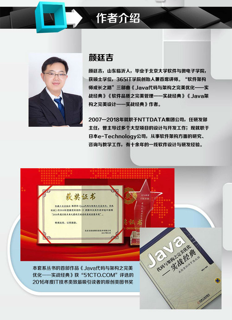 颜廷吉:《Java架构之完美设计 实战经典》介绍了软件架构师练就的方法、软件架构设计模式、软件架构思维、软件架构编程思想以及软件架构设计原则等,为软件架构设计的基本理论。