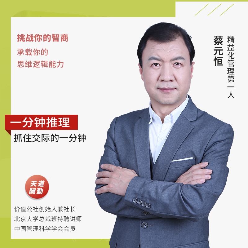 蔡元恒 ,精益化管理第一人;价值公社创始人兼社长;北京大学总裁班特聘讲师;组织管理、营销、文化、创新实践专家;中国管理科学学会会员;中国管理研究国际学会会员;中国战略与管理研究会会员;北京企业管理咨询协会副会长;中国新一代管理咨询与培训领军人物,具有战略管理、营销管理、组织管理、绩效管理等丰富的实战经验。拥有15年集团公司及上市公司高层管理经验,曾带领团队在九个月时间实现销售业绩从零到亿的突破,被称为行业营销神话!