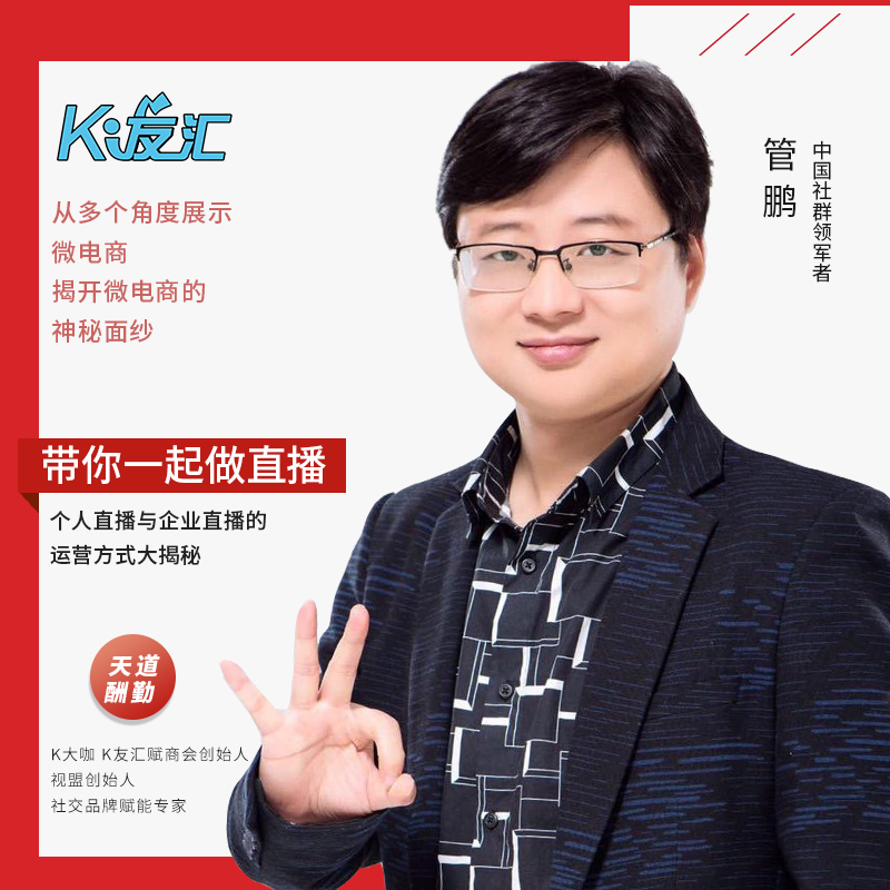 管鹏,K友汇发起人,皮精灵助理总裁,嘉诚投资合伙人,炎黄网络创始人腾讯V5推推发起人,百度创业者俱乐部理事,新浪微博专家委员会成员,安徽省青年电子商务协会副秘书长,中国虚拟互联网产业联盟顾委会副主任,创办全社交高端人脉生态平台K友汇,有几十万名K友参与互动。刘兴隆,微赢控股集团董事长、安徽省企业家联合会副会长、安徽省陕西商会副会长、徽商微商联盟主席、实战微营销专家。李七喜,演员、模特、创业者、网络红人。毕业于新加坡NanYangPolytechnic,中国90后女性创业者,7UP团队创始人,纤喜美品牌创始人,七喜酵素梅品牌创始人,2000万微商女神,个人IP打造倡导者。