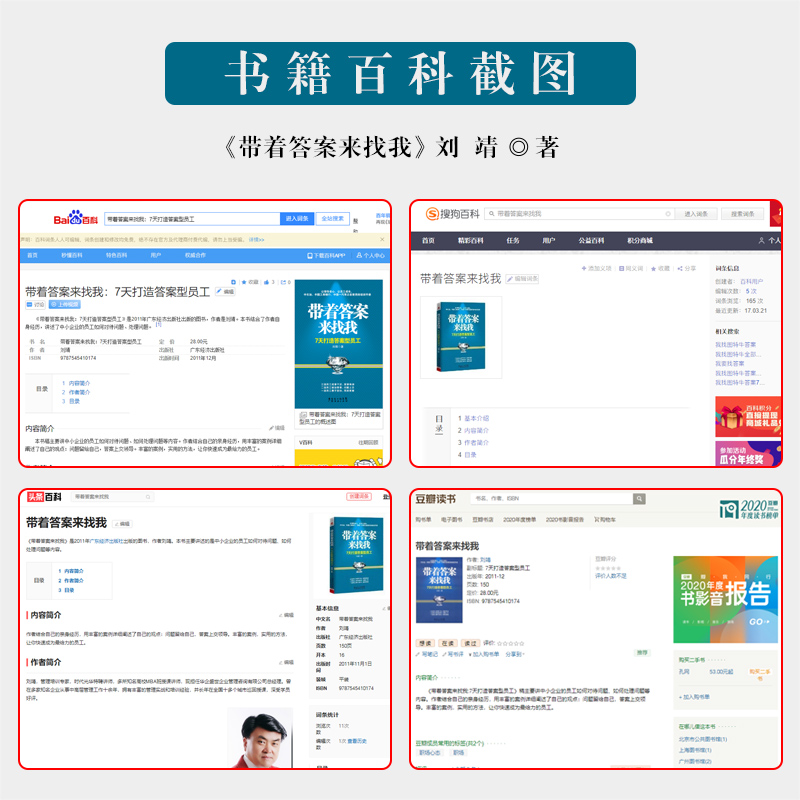 《向高效要业绩:倍增业绩的54种实战方法》为作者独立原创,没有□□任何专家的理论,不同于市场上晦涩难懂的理论专著,堪称一本脉络清晰、指导性强、有较强操作性的精英塑造实务指南。本书以众多名人事迹和企业故事串起管理学、心理学、社会学等多学科知识,以浅显易懂的语言阐述高效人士自我修炼之法、OJT之密码、打开高效之法的十大魔咒等内容。作者为撰写此书做了大量企业调研和人物采访的工作,在调研中解决问题,探索出更多向高效要业绩的方法,并升华了理论,形成了倍增业绩的54种实战方法。如果您掌握了本书阐述的一系列方法和技巧,养成高效率的工作习惯,必将获得持续性的回报。《带着答案来找我:7天打造答案型员工》主要讲中小企业的员工如何对待问题、如何处理问题等内容。作者结合自己的亲身经历,用丰富的案例详细阐述了自己的观点:问题留给自己,答案上交领导。丰富的案例,实用的方法,让你快速成为*给力的员工。