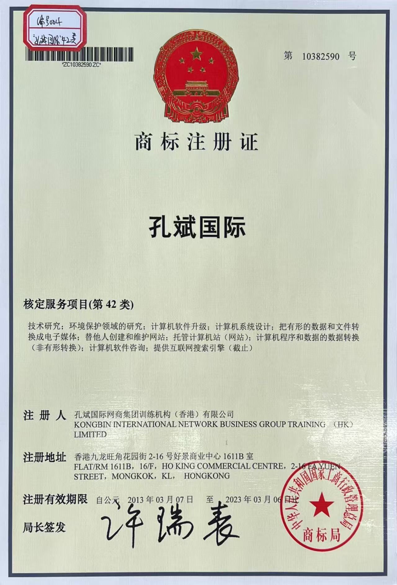 孔斌:孔斌国际商标注册证书:核定服务项目(42类)