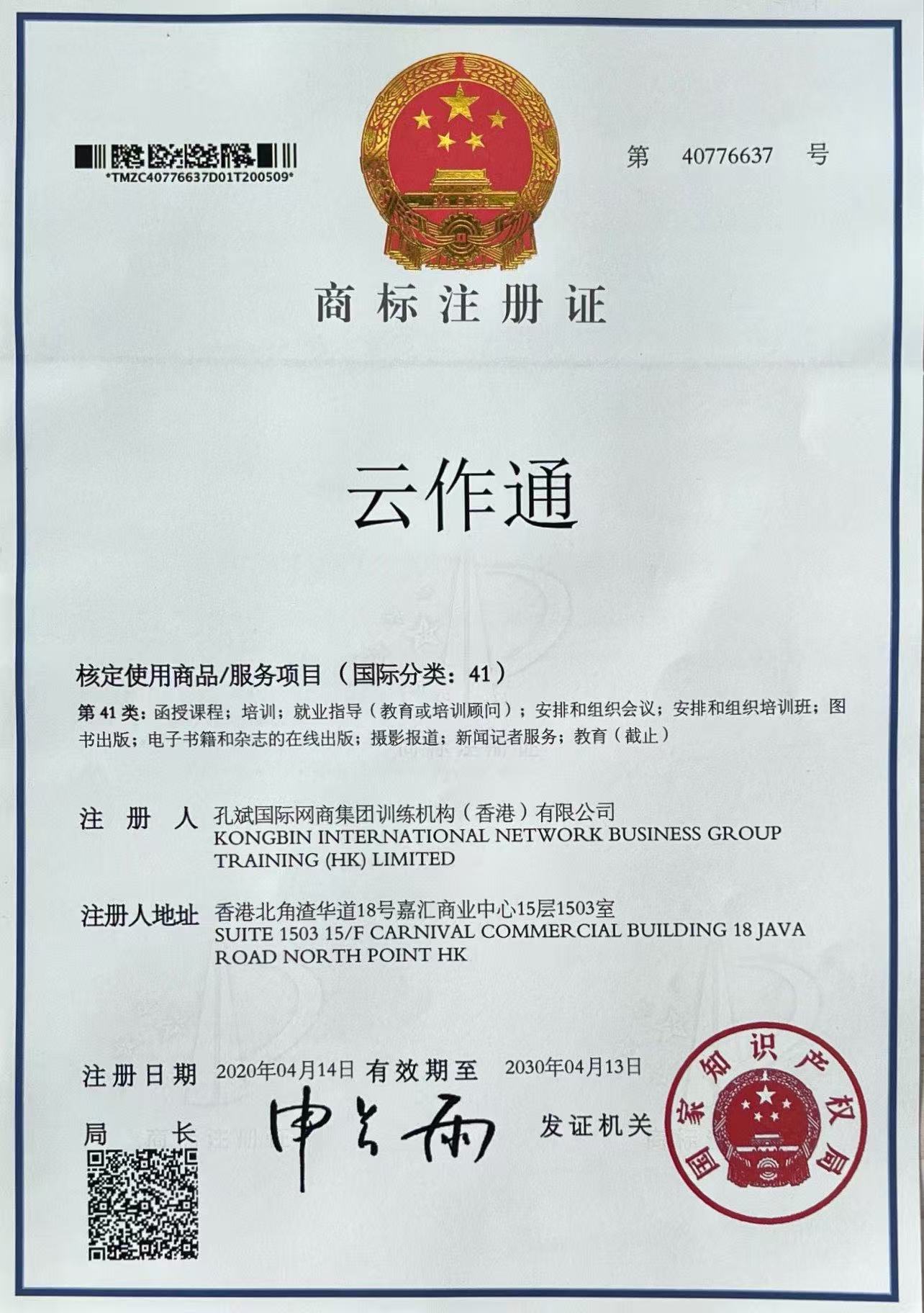 孔斌:云作通商标注册证书:核定使用商品/服务项目(国际分类:41)