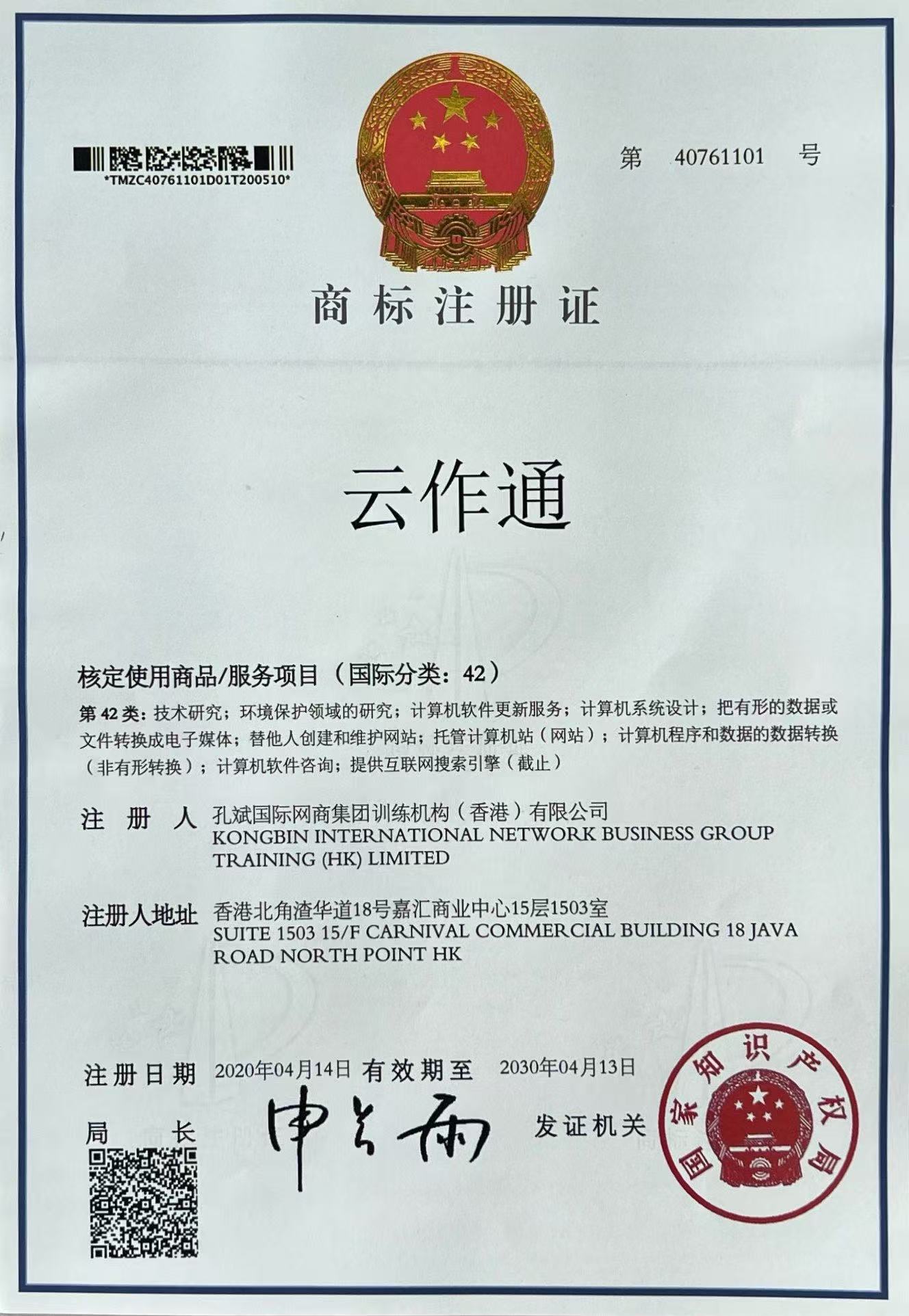 孔斌:云作通商标注册证书:核定使用商品/服务项目(国际分类:42)