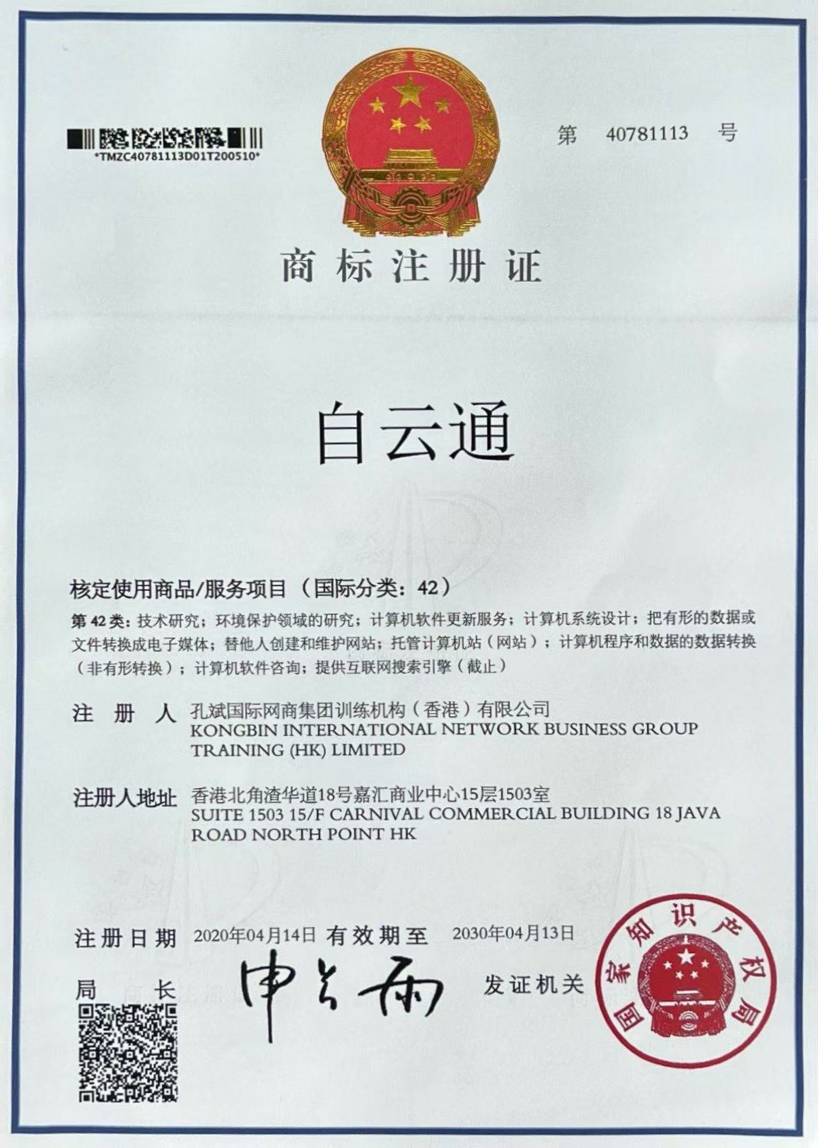 孔斌:自云通商标注册证书:核定使用商品/服务项目(国际分类:42)