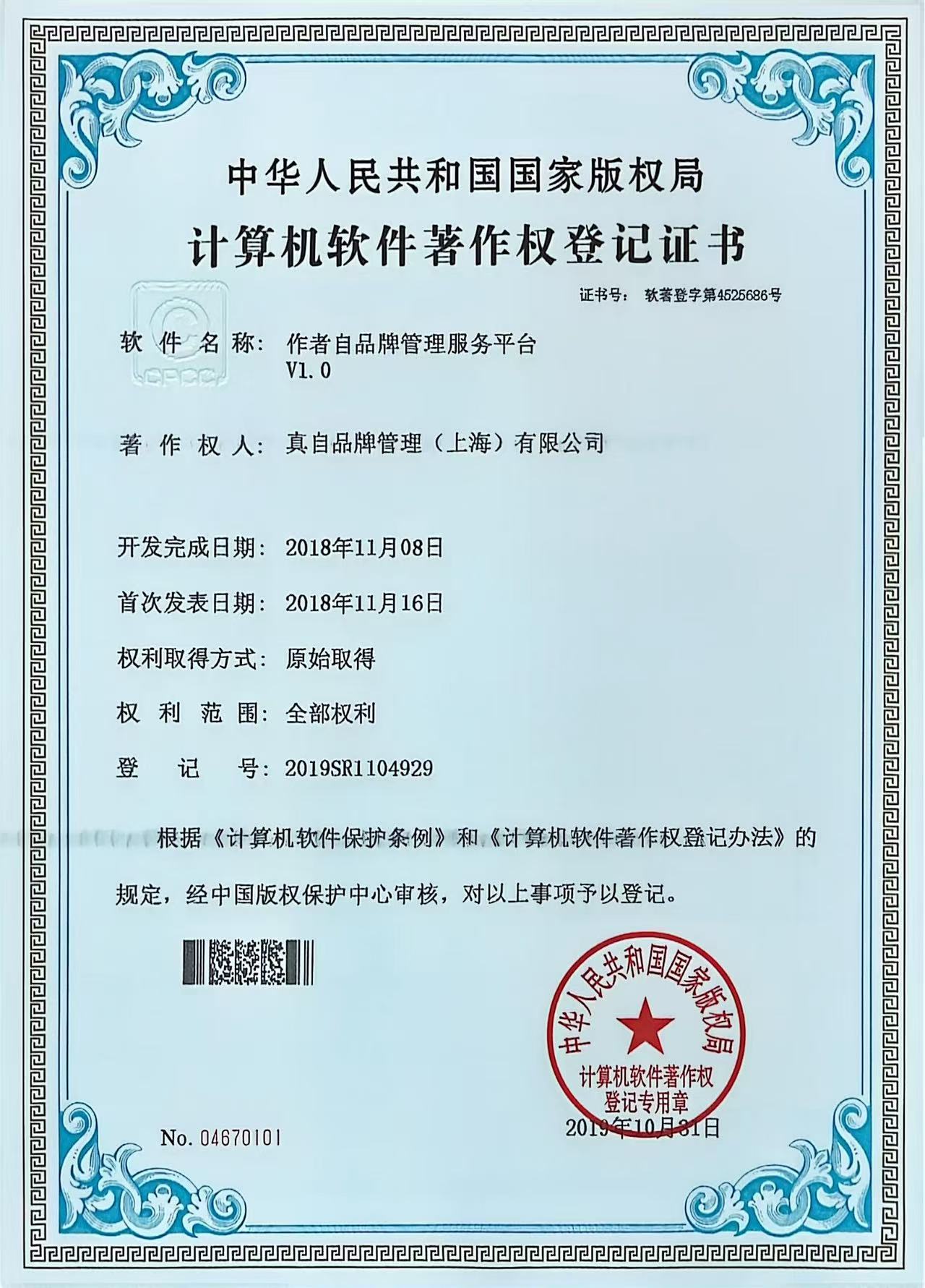 孔斌:作者自品牌管理服务平台V1.0·计算机软件著作权登记证书