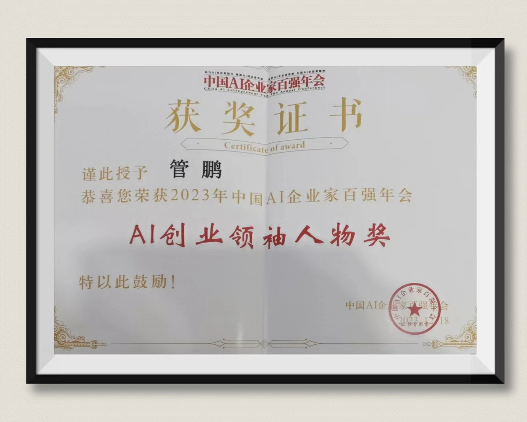 管鹏:荣获——2023年中国AI企业家百强年会“AI创业领袖人物”奖