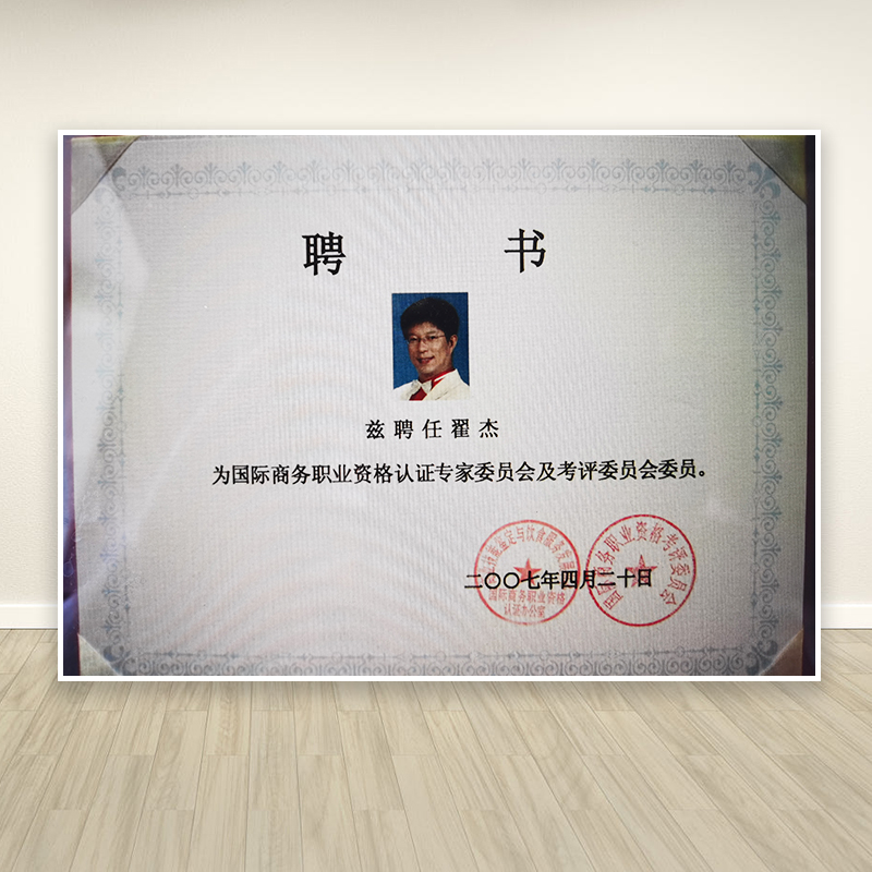 翟杰:国际商务职业资格认证专家委员会及考评委员会委员聘书
