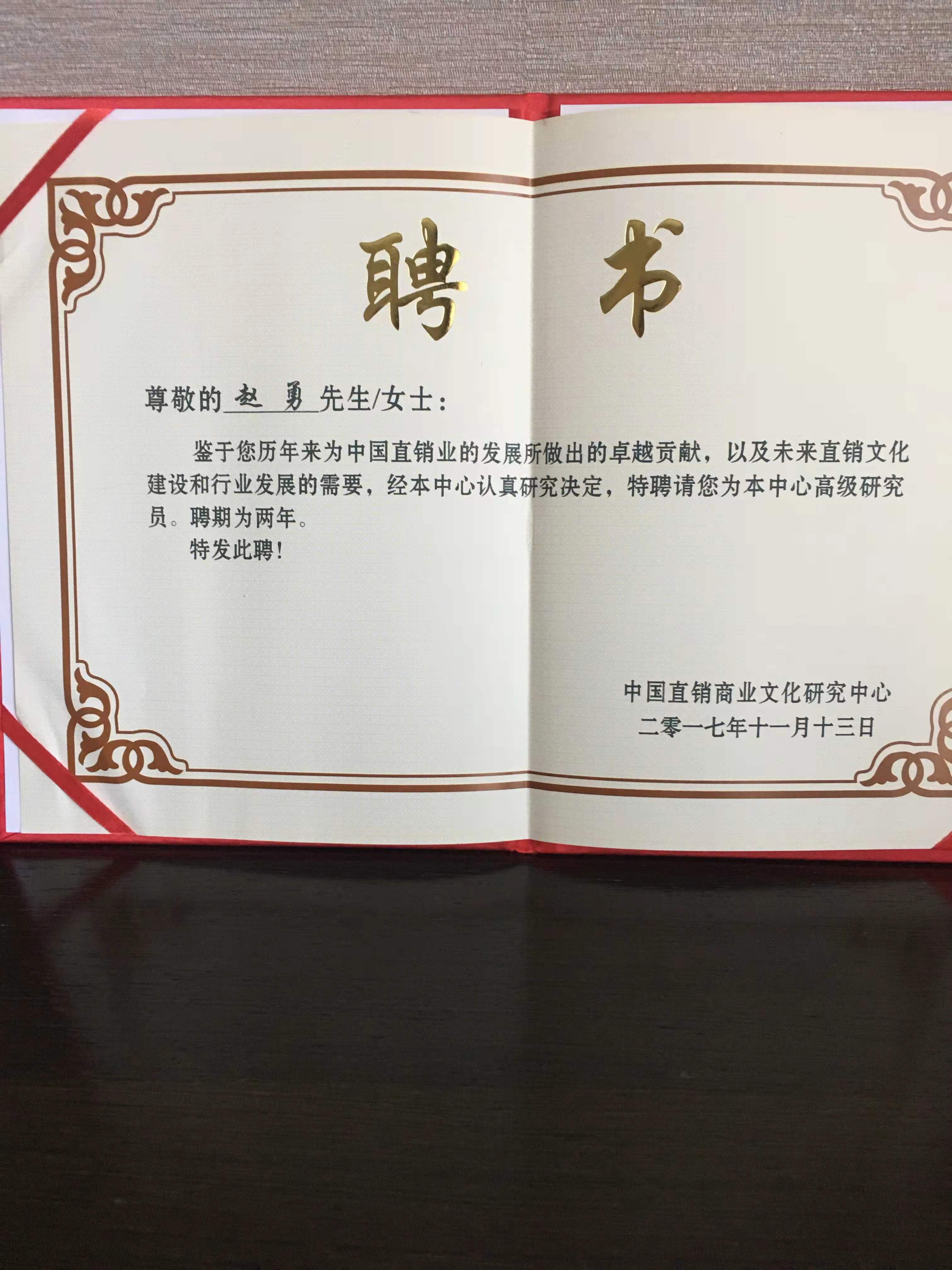 赵勇清:中国直销商业文化特聘证书