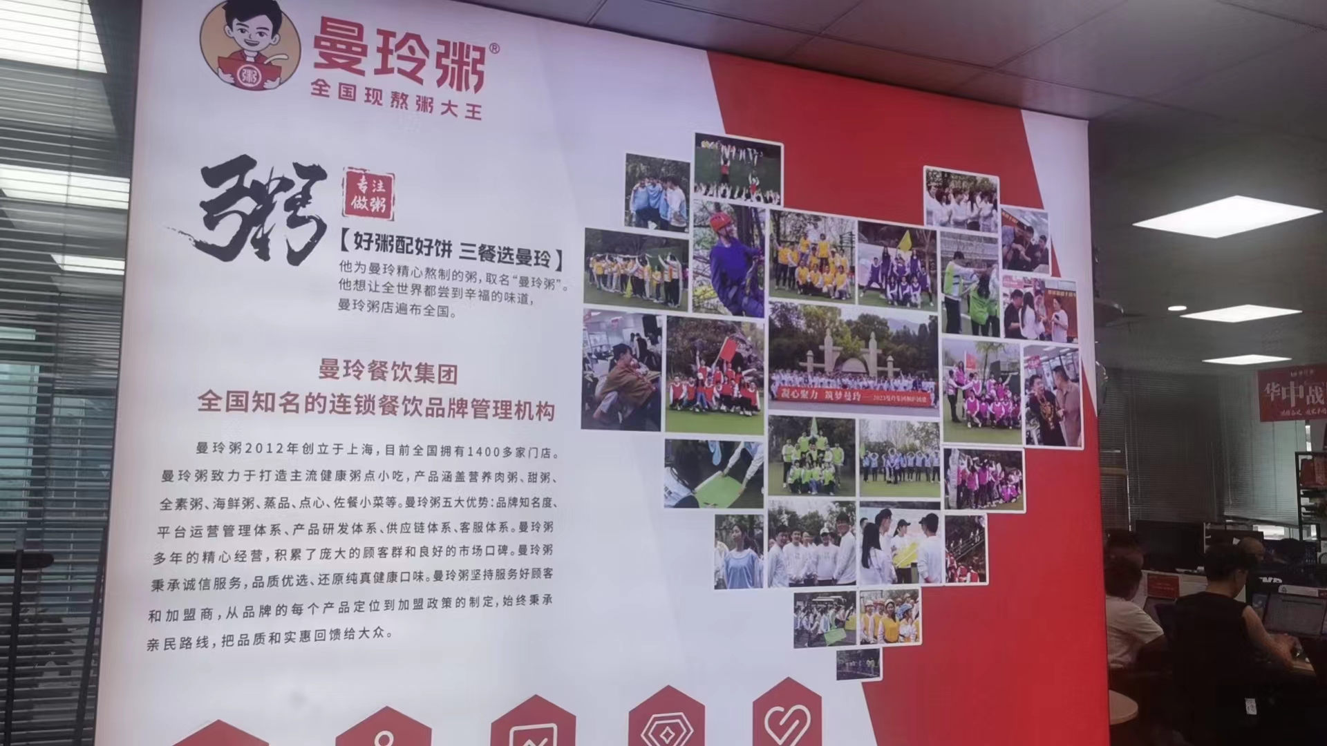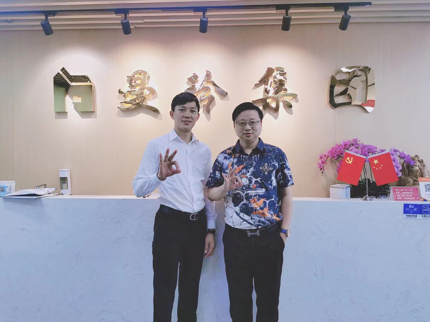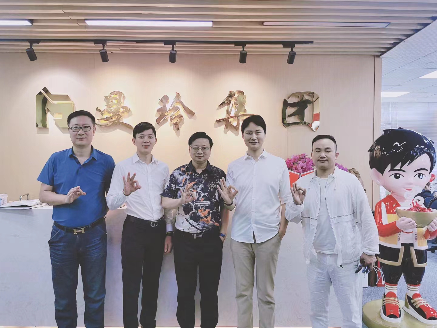 管鹏:大家一起在曼玲集团背景墙下合影