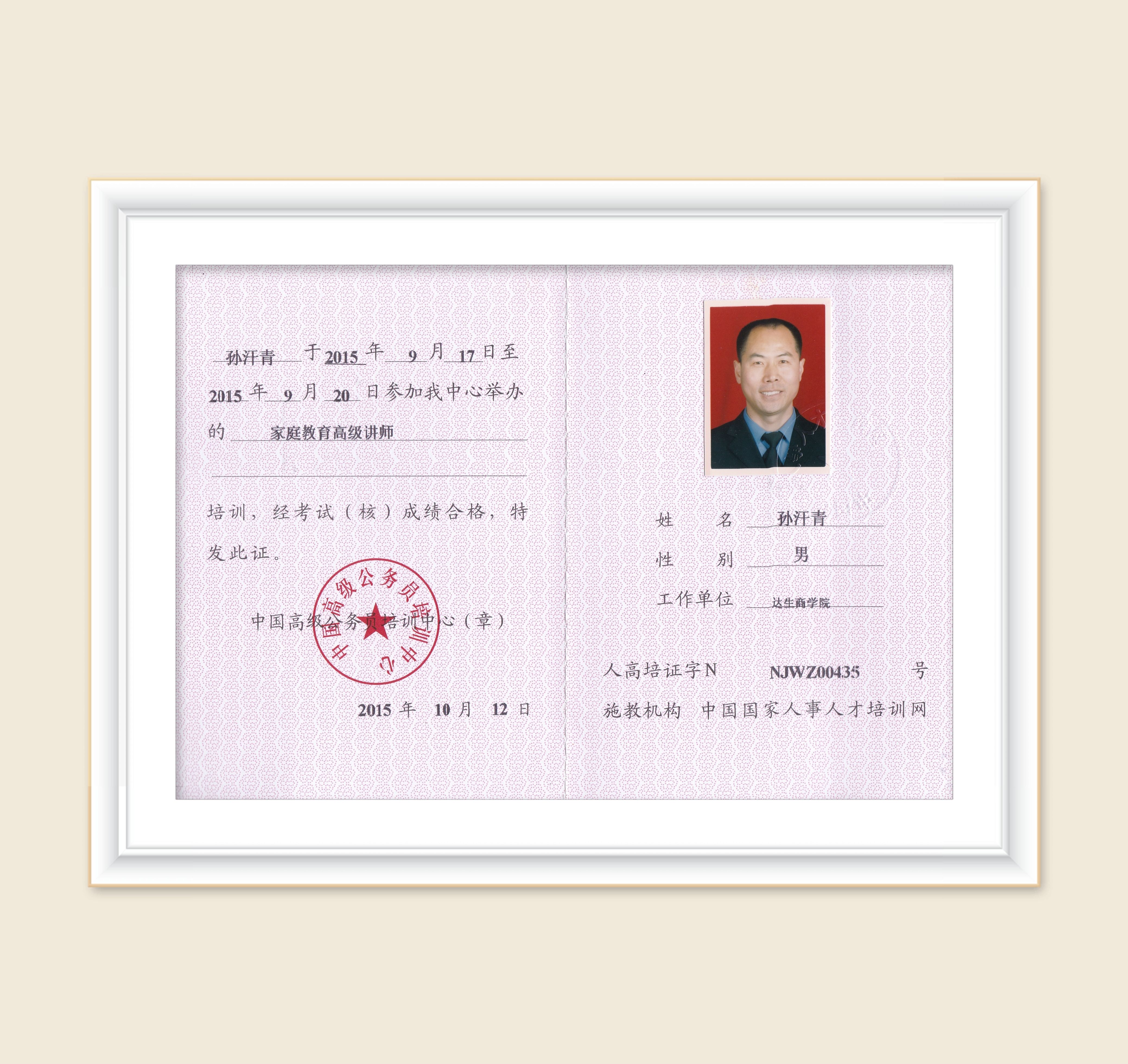 孙汗青:获得家庭教育高级讲师证书