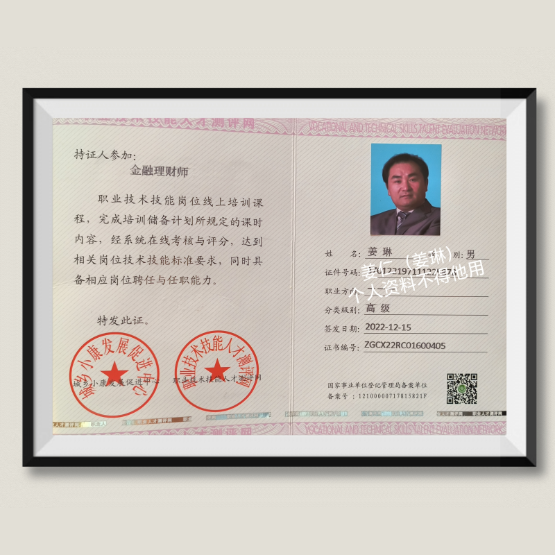 姜仁:荣获“高级金融理财师”证书