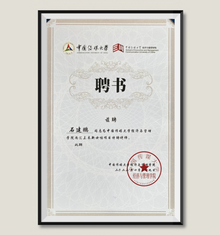 石建鹏:受聘为——“中国传媒大学经济与管理学员尚汇未来新女性项目特聘讲师”