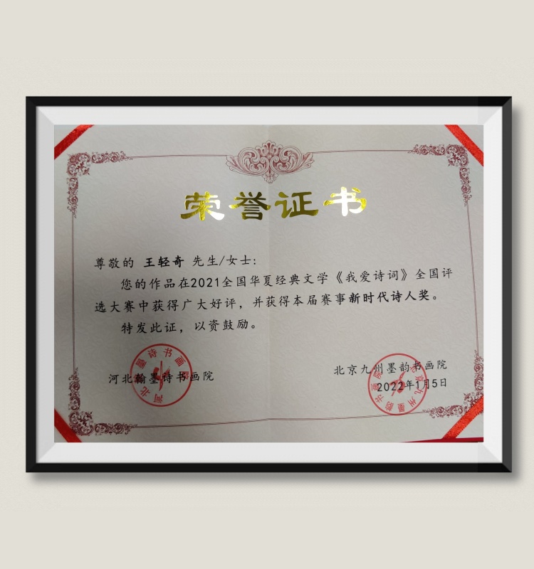 王轻奇:在2021全国华夏经典文学《我爱诗词》荣获荣誉证书。