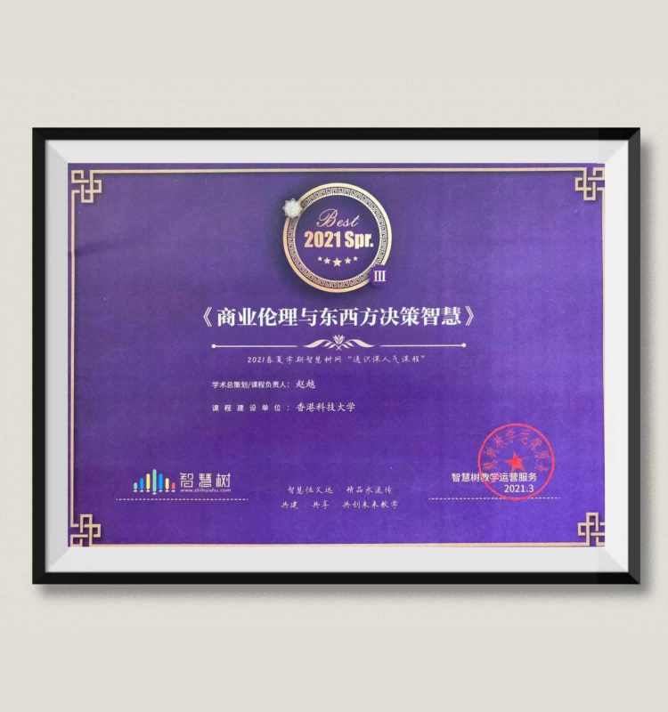 赵越:《商业伦理与东西方决策智慧》荣获——2021春夏学期智慧树网”通识课人气课程“