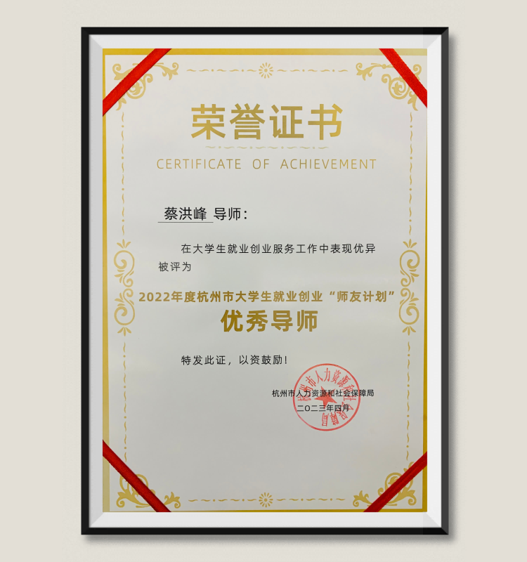 蔡洪峰:被评为“2022年度杭州市大学生就业创业“师友计划”优秀导师”