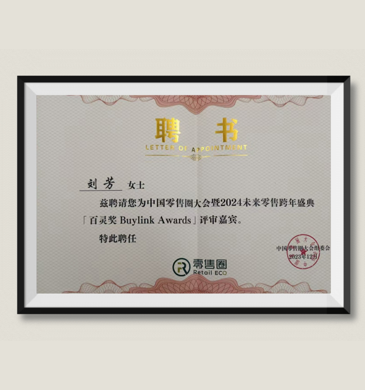 刘芳:受聘为“中国零售圈大会暨2024未来零售跨年盛典[百灵奖Buylink Awards]评审嘉宾”