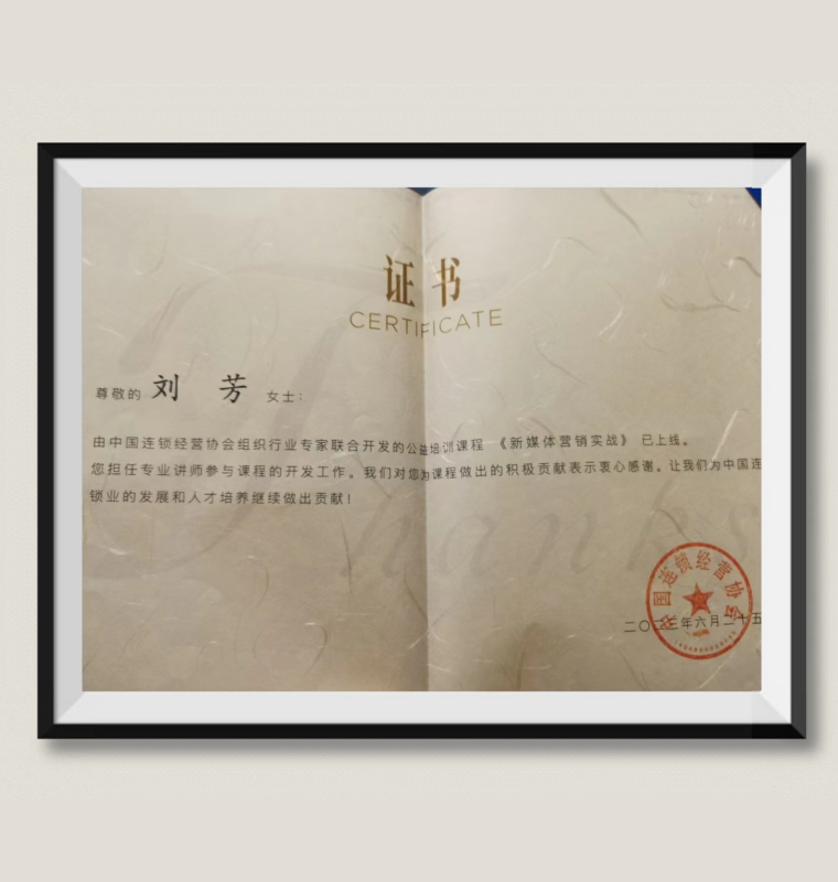刘芳:荣获中国连锁经营协会公益培训课程《新媒体营销实战》课程开发证书