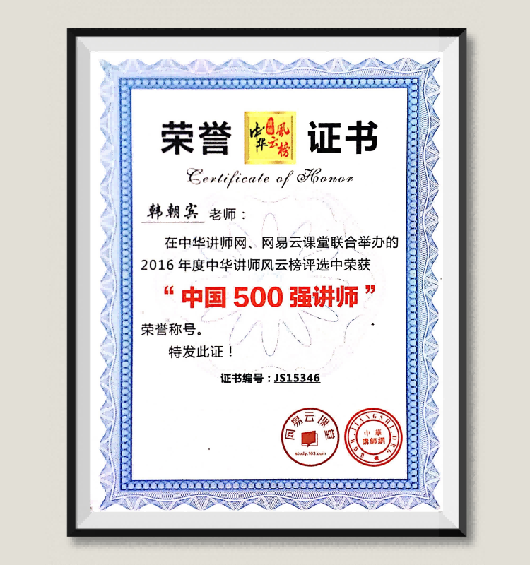 韩朝宾:荣获2016年度中华讲师网风云榜评选“中国500强讲师”