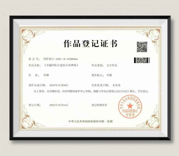 肖楠:《卓越团队打造的五项修炼》作品登记证书