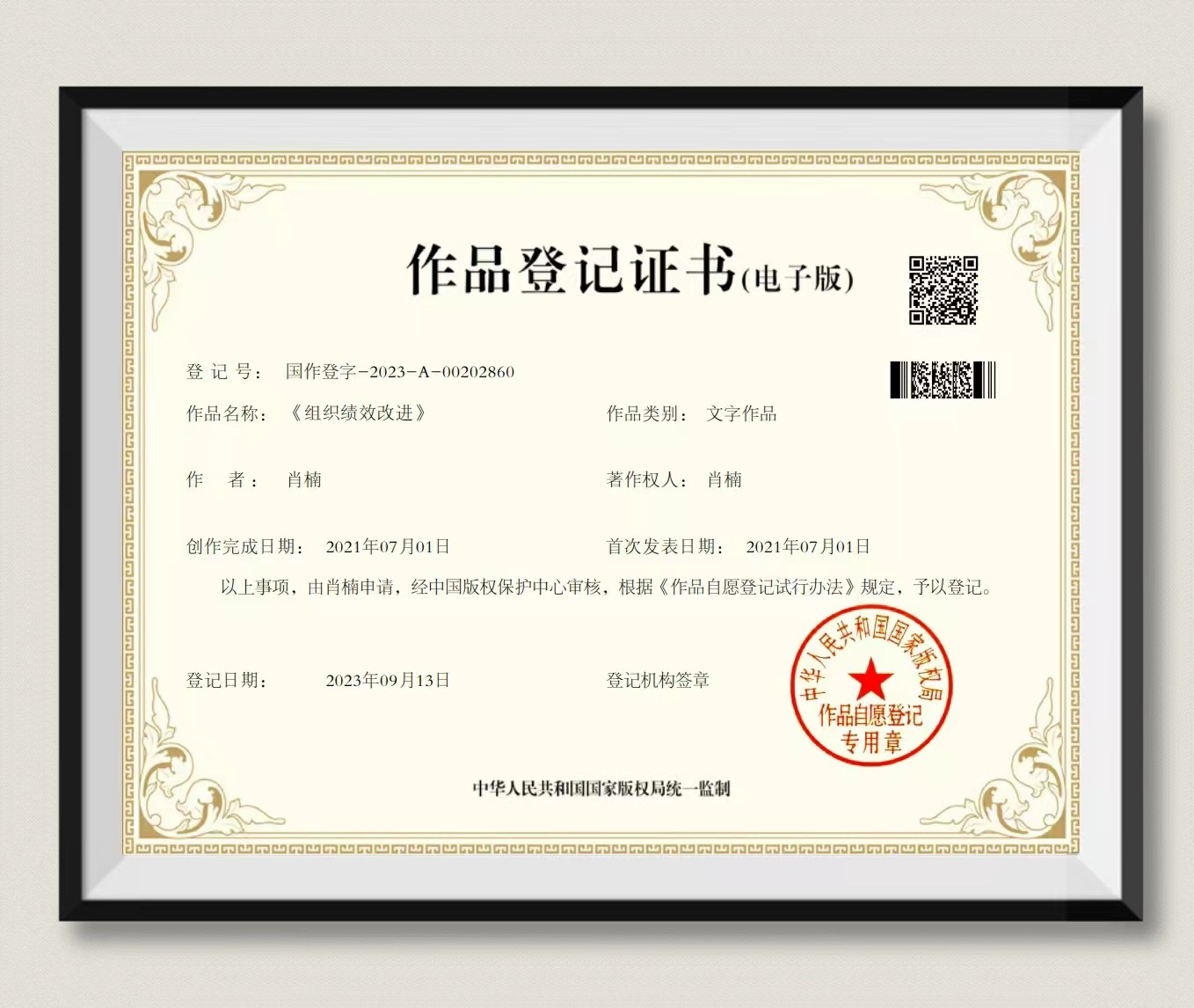 肖楠:《组织绩效改进》作品登记证书