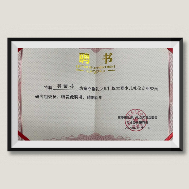 聂荣芬:受聘为“童心童礼少儿礼仪大赛少儿礼仪专业委员研究组委员”