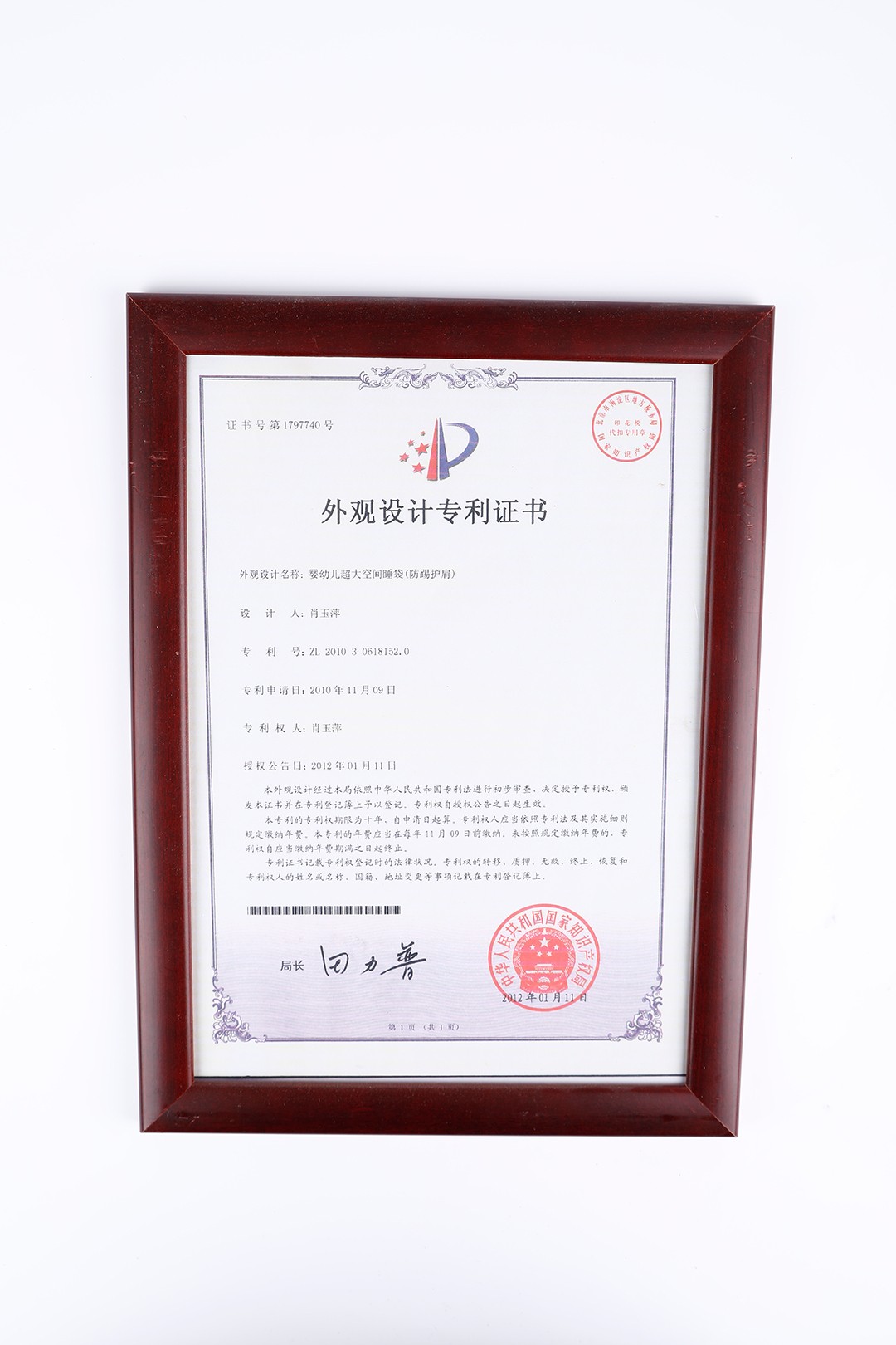 肖玉萍:婴幼儿睡袋外观设计专利证书