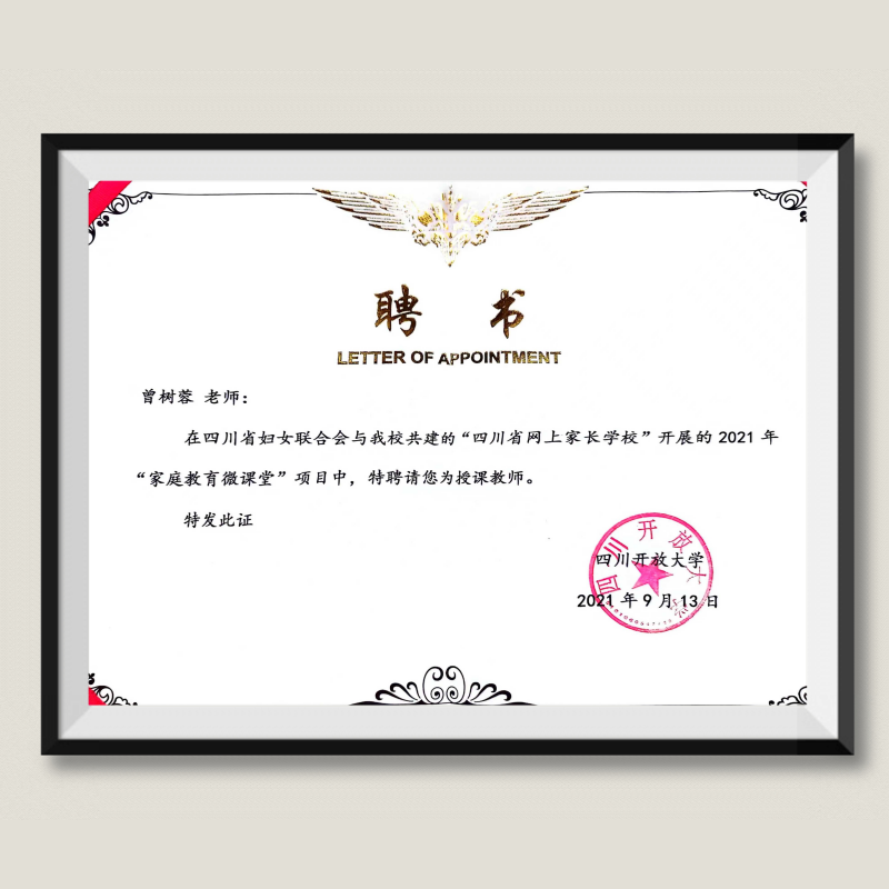 曾树蓉:荣获“注册正面管教注册学校讲师”证书