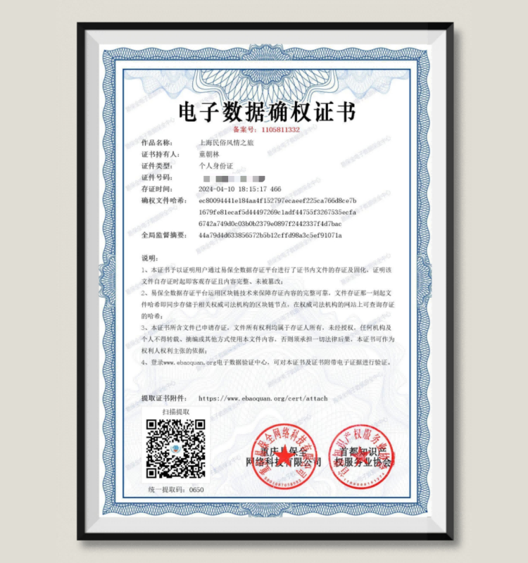 童朝林:上海民俗风情之旅确权证书