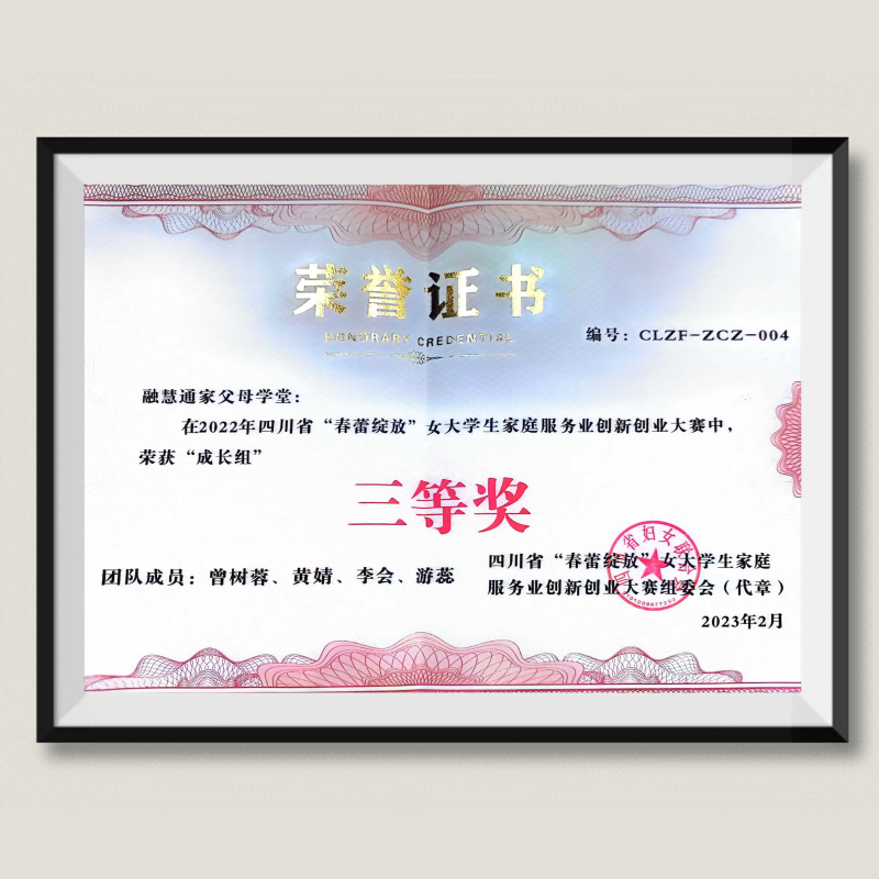 曾树蓉:荣获2022年四川省“春蕾绽放”女大学生家庭服务业创新创业大赛三等奖