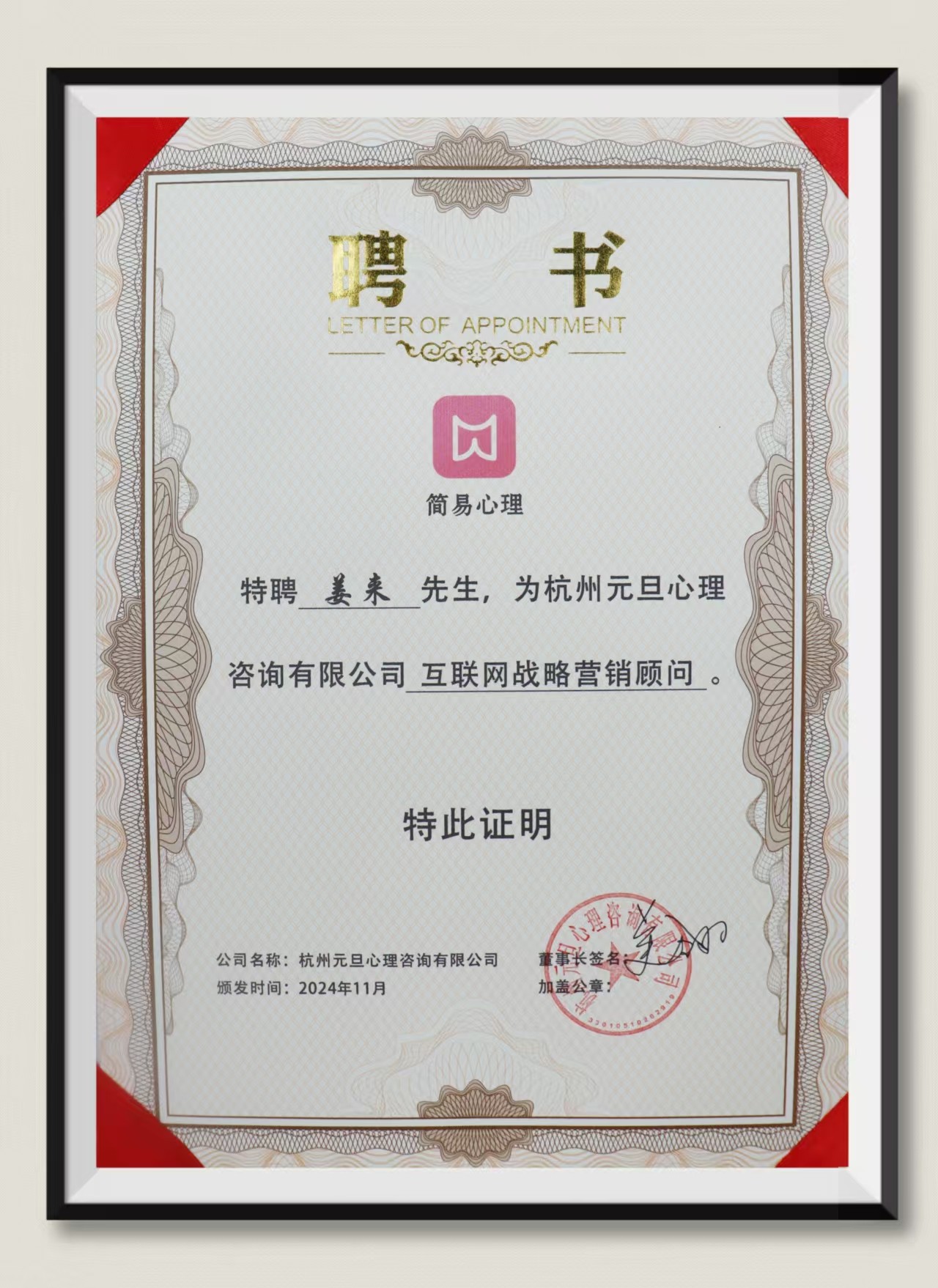 姜来:受聘为杭州元旦心理咨询有限公司“互联网战略营销顾问”